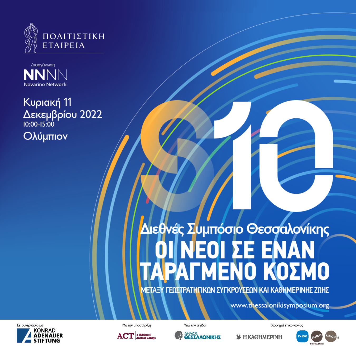 Η Πολιτιστική Εταιρεία Επιχειρηματιών Βορείου Ελλάδος, σε συνεργασία με το Δίκτυο Ναυαρίνο και το Ίδρυμα Konrad Adenauer, διοργανώνουν το 10ο Διεθνές Συμπόσιο Θεσσαλονίκης με θέμα: Οι νέοι σε έναν ταραγμένο κόσμο: μεταξύ γεωστρατηγικών συγκρούσεων και καθημερινής ζωής. Το φετινό Συμπόσιο, περιλαμβάνει τρεις θεματικές ενότητες: