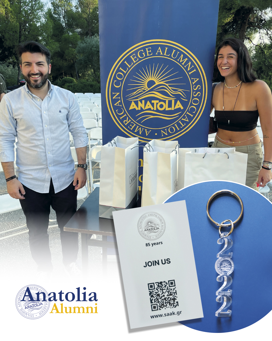 Καλωσορίζοντας την τάξη του 2022 στη μεγάλη οικογένεια των αποφοίτων του Κολλεγίου Ανατόλια που αριθμεί πάνω από 9000 μέλη, ο Σύλλογος Αποφοίτων Ανατόλια (ΣΑΑΚ) με ιδιαίτερη χαρά αποφάσισε να δωρίσει ένα αναμνηστικό μπρελόκ σε όλους τους νέους αποφοίτους τονίζοντας μάλιστα και τον εορτασμό των 85 χρόνων του ΣΑΑΚ.