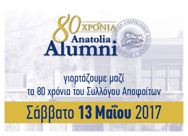 Mε μία λαμπρή εκδήλωση στο Μέγαρο Μουσικής Θεσσαλονίκης το Σάββατο 13 Μαΐου, ώρα 20:00 θα γιορτάσει τα 80 χρόνια λειτουργίας του ο Σύλλογος Αποφοίτων του Αμερικανικού Κολλεγίου Ανατόλια (Σ.Α.Α.Κ. Ανατόλια).