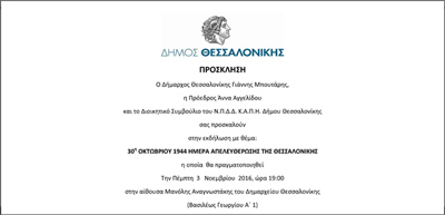 Την Πέμπτη 3 Νοεμβρίου στις 7:00μμ, η εθελοντική ομάδα φωναχτών λογοτεχνικών αναγνώσεων “Διάβασέ μου” θα συμμετέχει στην εκδήλωση του ΚΑΠΗ Θεσσαλονίκης, στην αίθουσα Μανώλης Αναγνωστάκης στο Δημαρχειακό Μέγαρο. Στην εκδήλωση αυτή με θέμα ” 30η Οκτωβρίου 1944, Ημέρα Απελευθέρωσης της Θεσσαλονίκης’’,  οι εθελόντριες της ομάδας θα διαβάσουν λογοτεχνικά κείμενα μαζί με μέλη του ΚΑΠΗ.