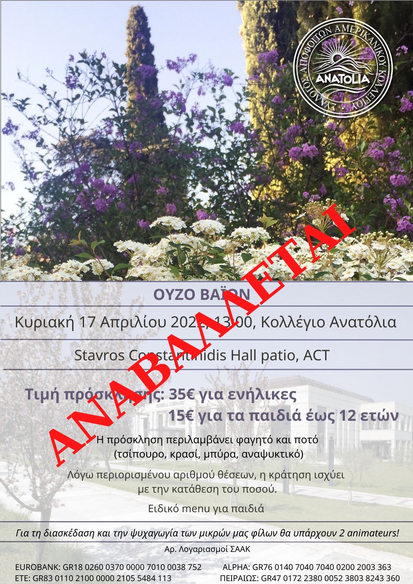 ΑΝΑΒΑΛΛΕΤΑΙ λόγω έκτακτων δυσμενών καιρικών συνθηκών το Ούζο των Βαΐων το οποίο ήταν προγραμματισμένο για την Κυριακή 17 Απρίλιου, 13:00, στον προαύλειο χώρο του campus ACT. Θα σας ενημερώσουμε το συντομότερο δυνατόν για τη νέα ημερομηνία διεξαγωγής της εκδήλωσης.
